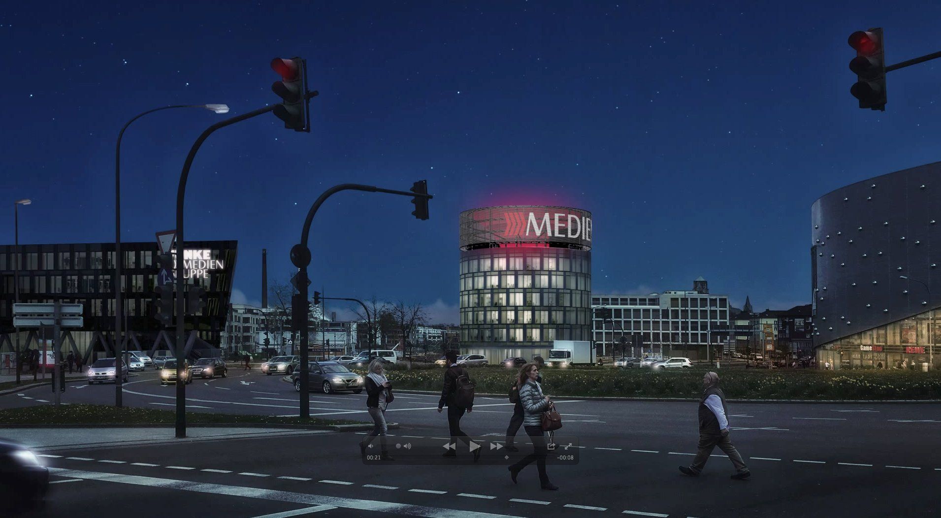 Die Funke Mediengruppe hat 2018 ihren Firmensitz neugebaut. Als Abschluss des Turmgebebäude ist eine Medienfassade entstanden. Wir haben die architektonische und medientechnische Installation in allen Details geplant und die Grundlagen für die Vermarktung geschaffen.