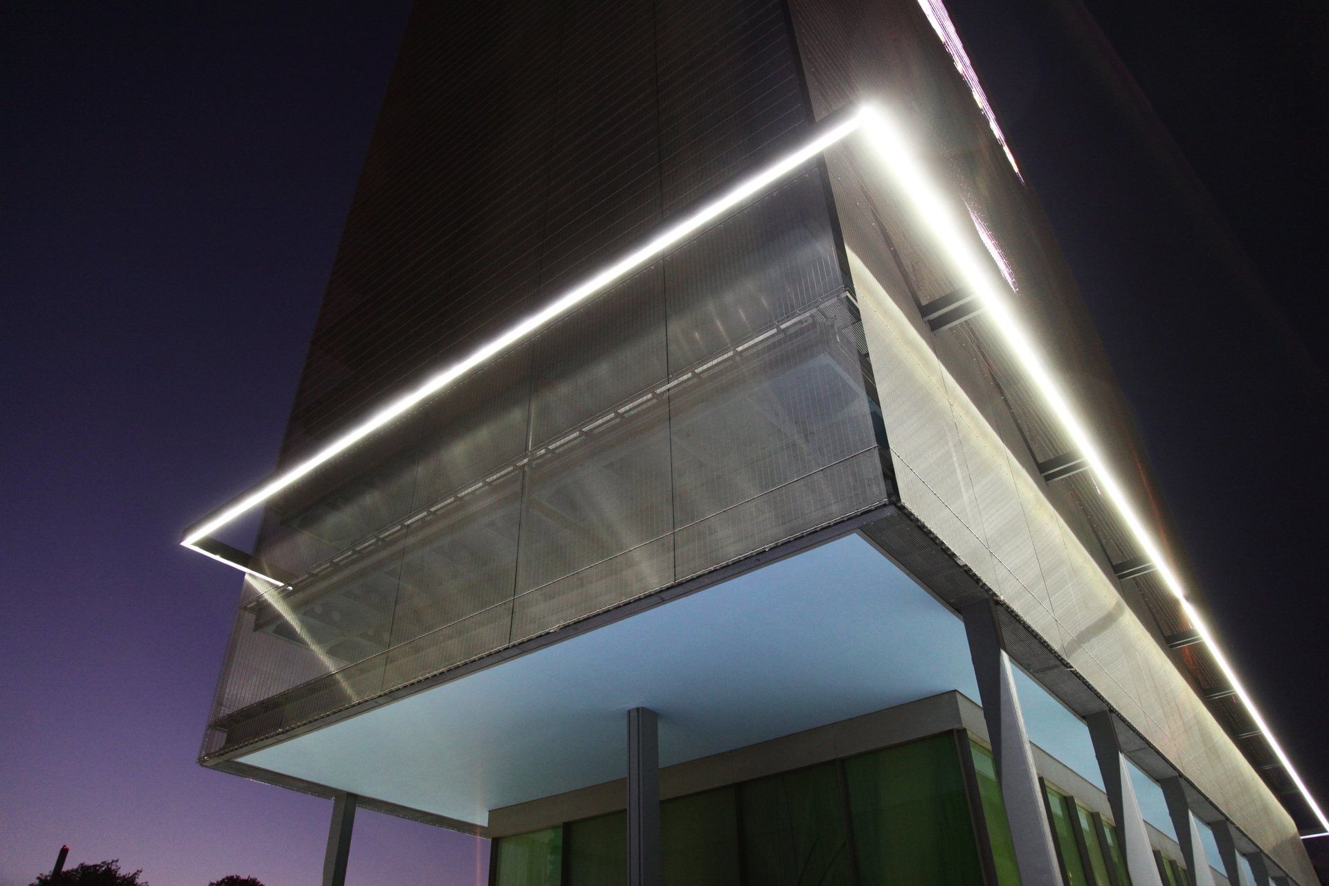 In order to mediatize such a large façade, "IlluMesh" was developed together with GKD in Düren. Front profiles with LEDs illuminate the stainless steel mesh, making video images possible at the given viewing distance.
