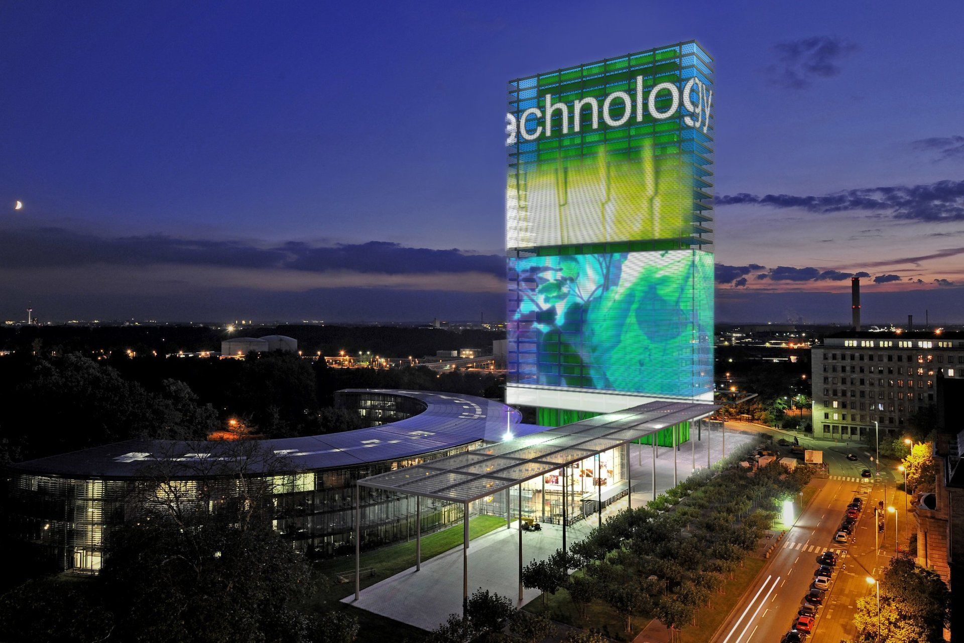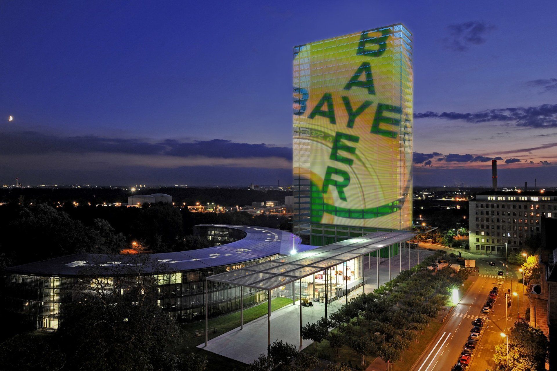 Helmut Jahn built the new company headquarters in 2007. This involved the decision to abandon the old high-rise. We were able to convince Bayer to transform this high-rise into a media landmark. To do this, the building was completely gutted and clad in a stainless steel mesh with integrated LEDs.